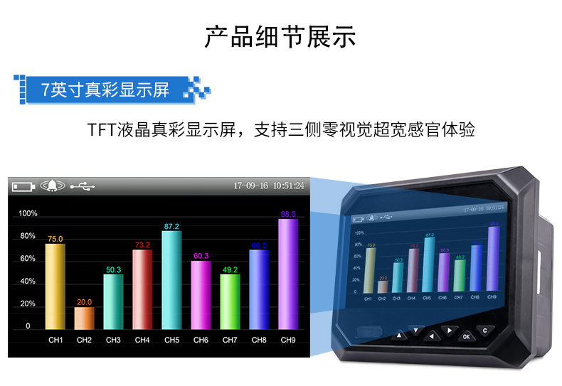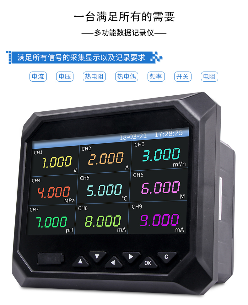 無(wú)紙記錄儀是將采集的數(shù)據(jù)/運(yùn)算數(shù)據(jù)以時(shí)間為基軸記錄在儀器內(nèi)部的存儲(chǔ)系統(tǒng)中,無(wú)消耗任何常用的記錄設(shè)施,如:紙張、筆墨。記錄在儀器內(nèi)部的存儲(chǔ)數(shù)據(jù),通過(guò)運(yùn)算、模擬后顯示在液晶屏。常用顯示用液晶屏比較廣泛。在液晶屏屏幕上,可以顯示數(shù)字顯示、棒圖顯示、曲線顯示、報(bào)警列表等。無(wú)紙記錄儀采集的數(shù)據(jù),常用的有:溫度、壓力、流量、液位、電壓、電流、濕度、頻率、振動(dòng)、轉(zhuǎn)速等。